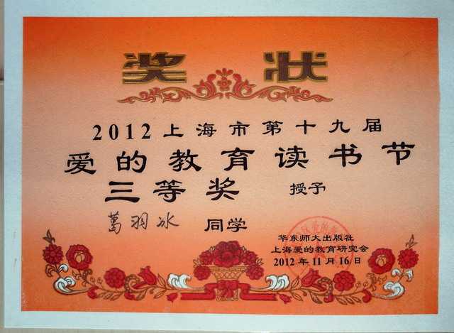 2012.11葛羽冰----获2012上海市第19届爱的教育读书节三等奖(奖状).jpg
