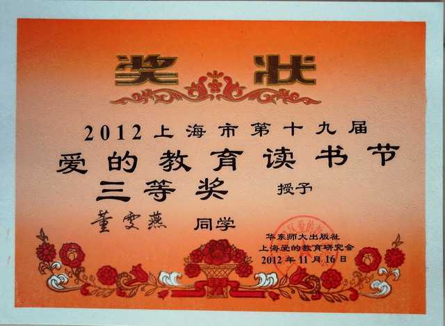 2012.11董雯燕----获2012上海市第19届爱的教育读书节三等奖(奖状).jpg