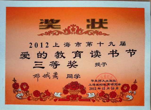 2012.11邓城晟----获2012上海市第19届爱的教育读书节三等奖(奖状).jpg