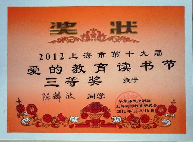 2012.11陈麟波----获2012上海市第19届爱的教育读书节三等奖(奖状).jpg
