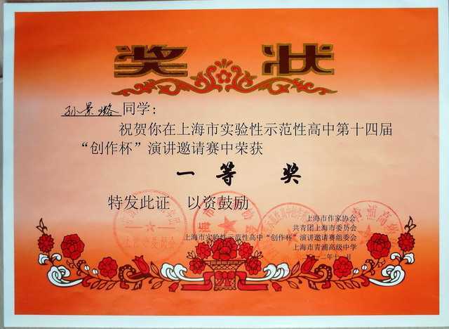 2012.11孙景璐----获上海市实验性示范性高中第14届“创作杯”演讲一等奖(指导老师:王维刚、戴玲)(奖状).jpg