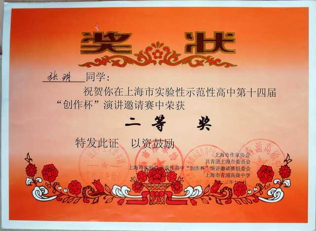 2012.11张玥----获上海市实验性示范性高中第14届“创作杯”演讲二等奖(指导老师:王维刚、戴玲)(奖状).jpg
