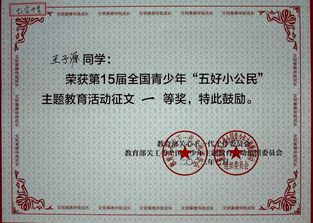 2012.07王子源----获第15届全国青少年五好小公民主题教育活动征文一等奖(证书).jpg