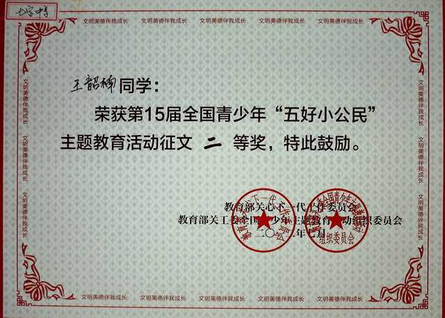 2012.07王韶楠----获第15届全国青少年五好小公民主题教育活动征文二等奖(证书).jpg