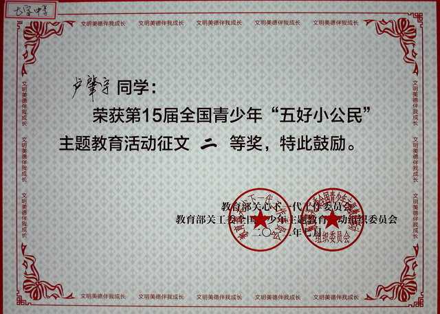 2012.07卢肇宇----获第15届全国青少年五好小公民主题教育活动征文二等奖(证书).jpg