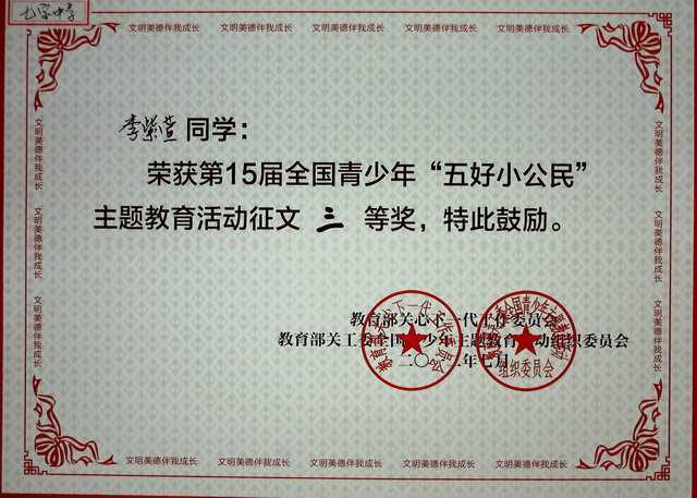 2012.07李紫萱----获第15届全国青少年五好小公民主题教育活动征文三等奖(证书).jpg