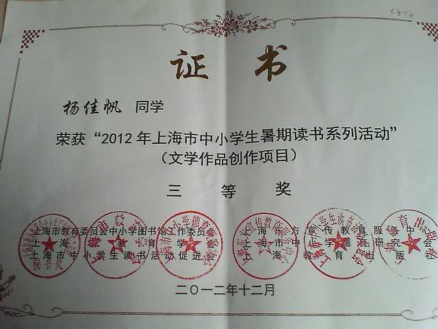 杨佳帆----获2012年上海市中小学生暑期读书系列活动(文学作品创作项目)三等奖(证书)