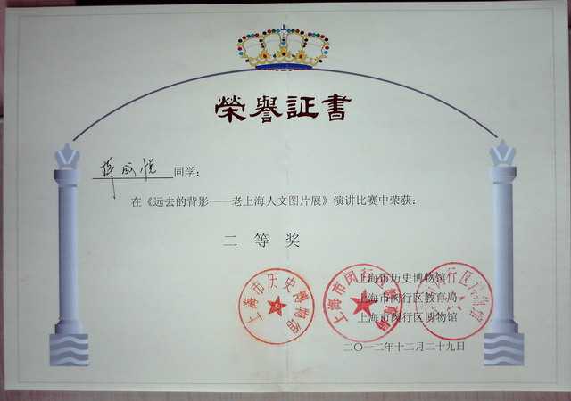 蒋成悦、孙景璐、杨自强----获《远去的背影----老上海人文图片展》演讲比赛一、二等奖(证书)