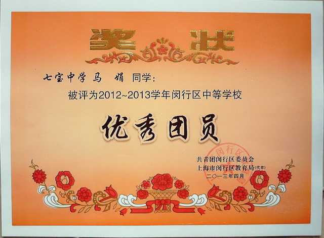 2013.04马娟----被评为2012-2013学年闵行区中等学校优秀团员(奖状).jpg