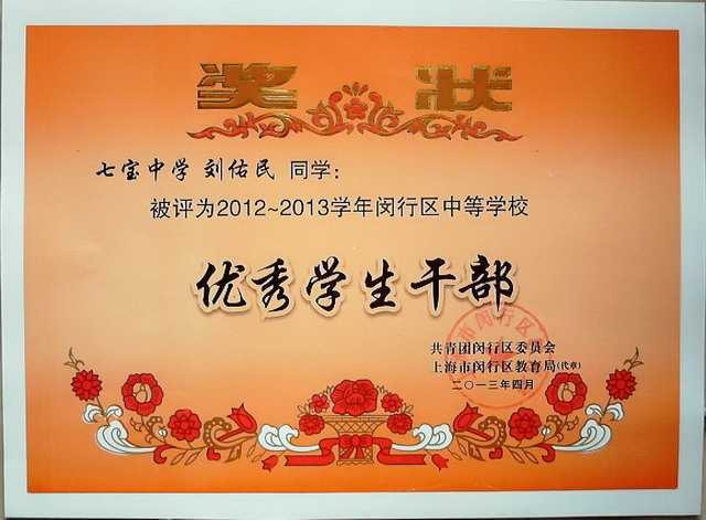 2013.04刘佑民----被评为2012-2013学年闵行区中等学校优秀学生干部(奖状).jpg