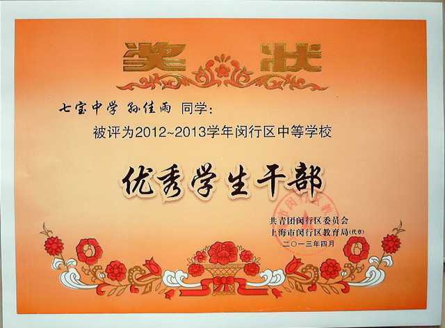 2013.04孙佳雨----被评为2012-2013学年闵行区中等学校优秀学生干部(奖状).jpg
