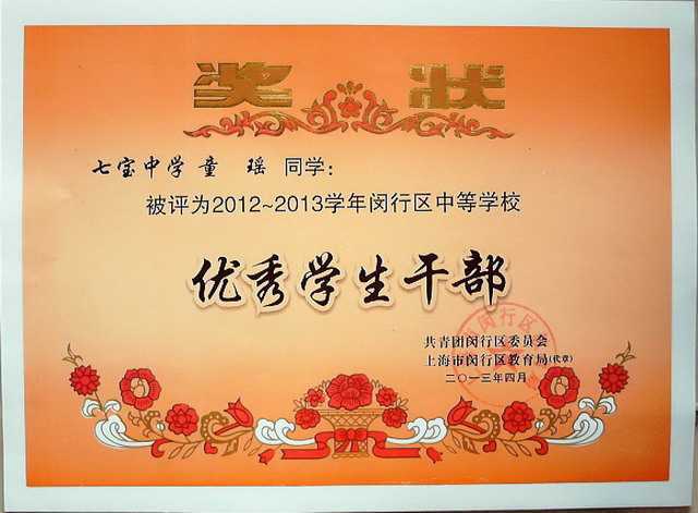 2013.04童瑶----被评为2012-2013学年闵行区中等学校优秀学生干部(奖状).jpg