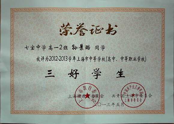 孙景璐----评为2012-2013学年上海市中等学校(高中、中等职业学校)三好学生(证书)