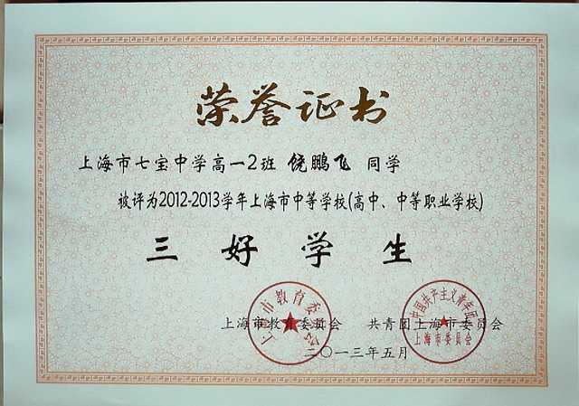 饶鹏飞----评为2012-2013学年上海市中等学校(高中、中等职业学校)三好学生(证书)