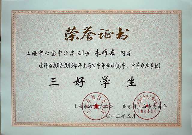 朱唯崧----评为2012-2013学年上海市中等学校(高中、中等职业学校)三好学生(证书)