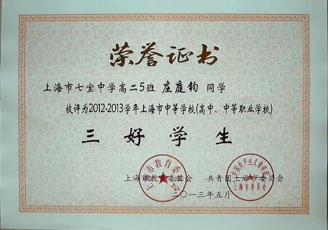 庄庭钧----评为2012-2013学年上海市中等学校(高中、中等职业学校)三好学生(证书)