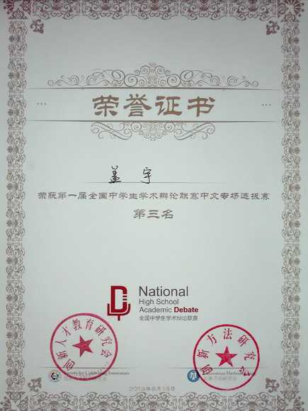 2013.09盖宇----获第一届全国中学生学术辩论联赛中文专场选拔赛第三名(证书).jpg