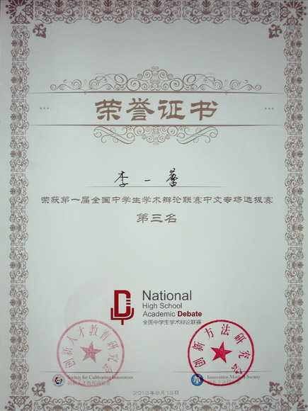 2013.09李一蕾----获第一届全国中学生学术辩论联赛中文专场选拔赛第三名(证书).jpg