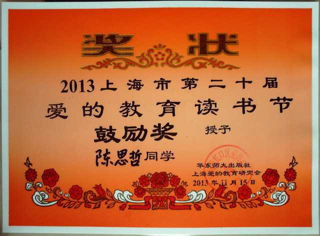 2013.11陈思哲----获2013上海市第20届爱的教育读书节鼓励奖(奖状).jpg