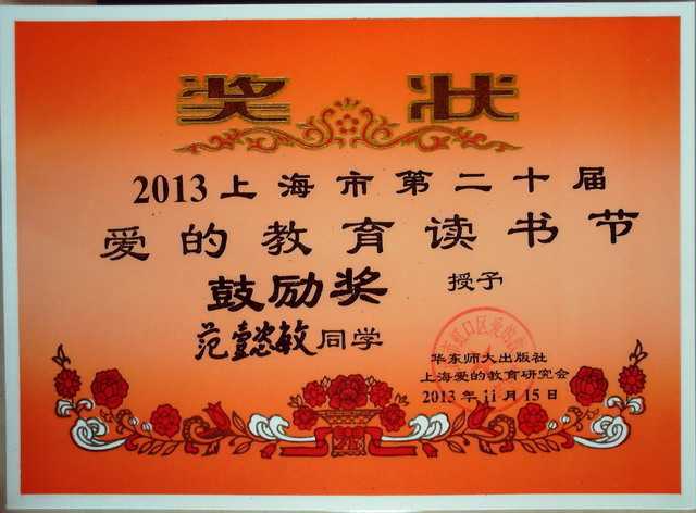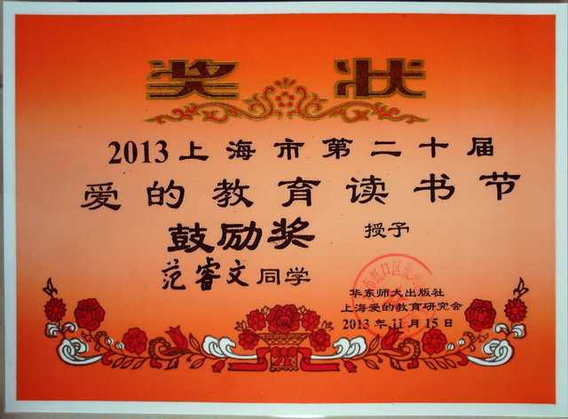 2013.11范睿文----获2013上海市第20届爱的教育读书节鼓励奖(奖状).jpg