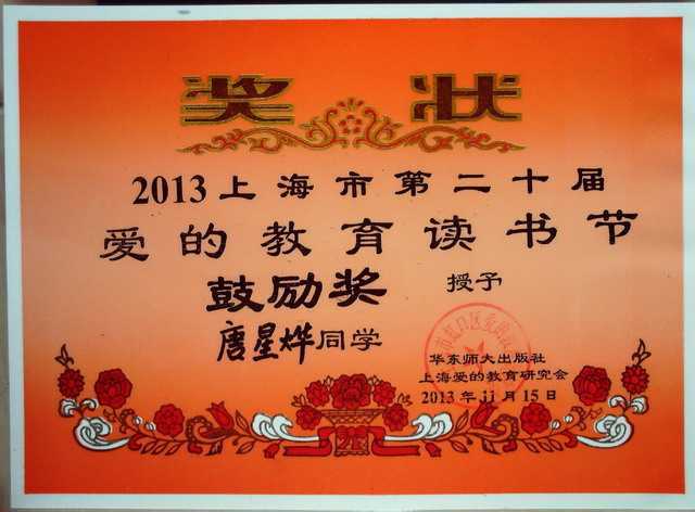 2013.11唐星烨----获2013上海市第20届爱的教育读书节鼓励奖(奖状).jpg
