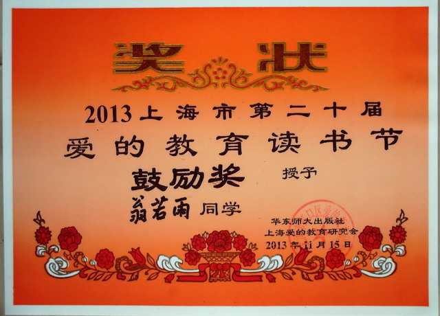 2013.11翁若雨----获2013上海市第20届爱的教育读书节鼓励奖(奖状).jpg