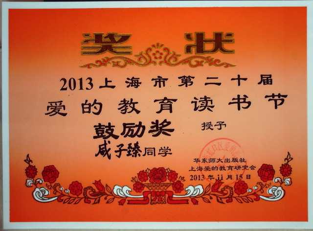 2013.11咸子臻----获2013上海市第20届爱的教育读书节鼓励奖(奖状).jpg