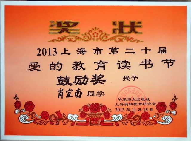 2013.11肖宜南----获2013上海市第20届爱的教育读书节鼓励奖(奖状).jpg
