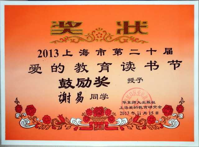 2013.11谢易----获2013上海市第20届爱的教育读书节鼓励奖(奖状).jpg