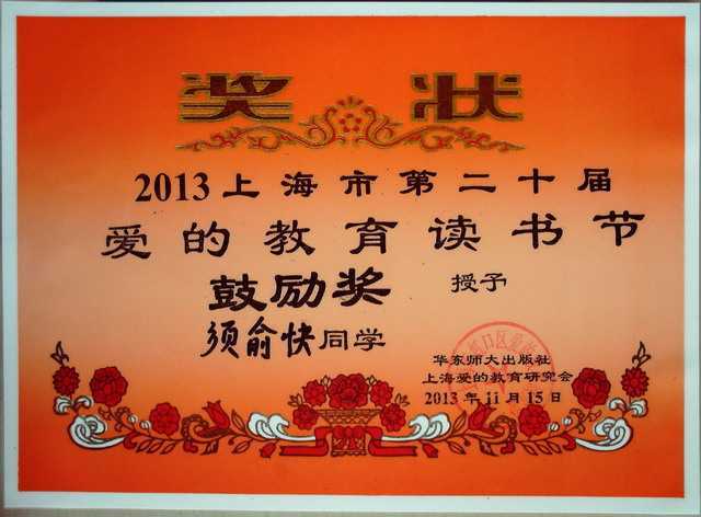2013.11须俞快----获2013上海市第20届爱的教育读书节鼓励奖(奖状).jpg