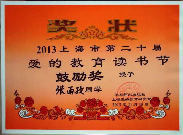 2013.11张雨孜----获2013上海市第20届爱的教育读书节鼓励奖(奖状).jpg