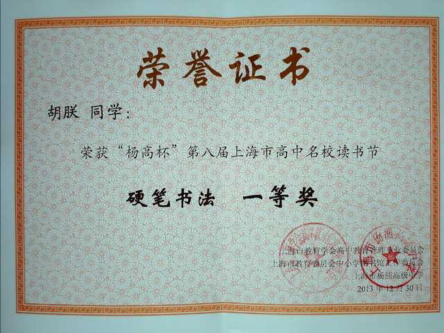 2013.12胡朕----获“杨高杯”第八届上海市高中名校读书节硬笔书法一等奖(证书).jpg