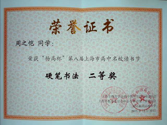 2013.12周之恺----获“杨高杯”第八届上海市高中名校读书节硬笔书法二等奖(证书).jpg