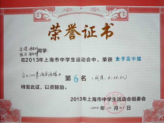 2013.12吕瑾、李思昕、张洁、胡祉睛----获2013年上海市中学生运动会女子高中组4×100米混合泳接力第六名(证书).jpg