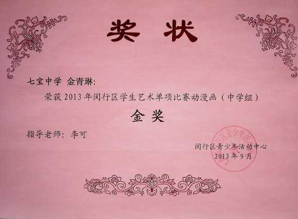 2013.09金青琳----获2013年闵行区学生艺术单项比赛动漫画(中学组)金奖(指导老师 李可)(奖状).jpg
