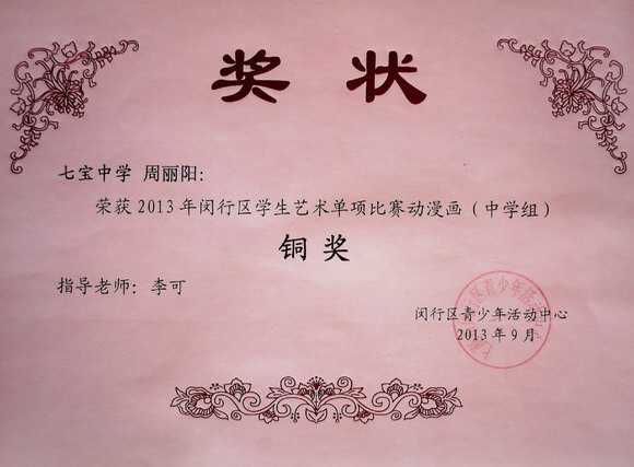 2013.09周丽阳----获2013年闵行区学生艺术单项比赛动漫画(中学组)铜奖(指导老师 李可)(奖状).jpg