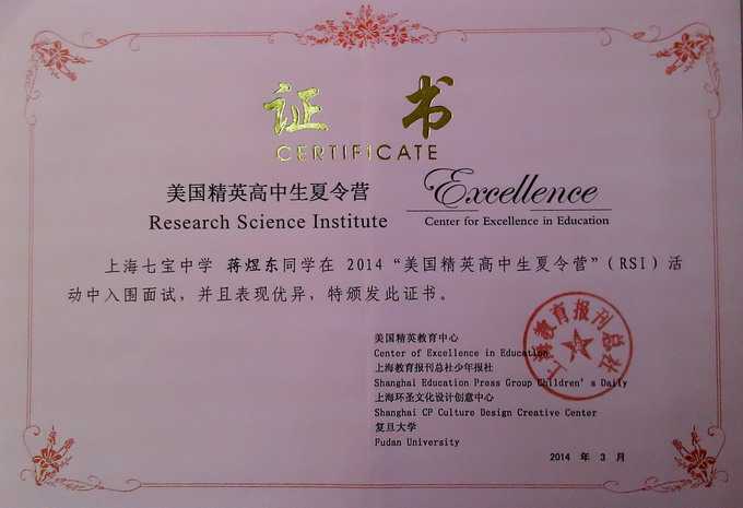 蒋煜东----获2014“美国精英高中生夏令营”(RSI)活动入围面试(证书)(感谢信)