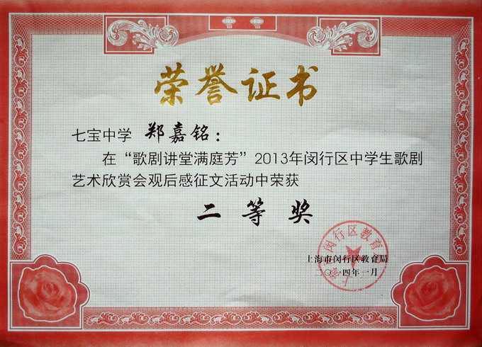郑嘉铭----获“歌剧讲堂满庭芳”2013年区中学生歌剧艺术欣赏会观后感征文二等奖(证书)