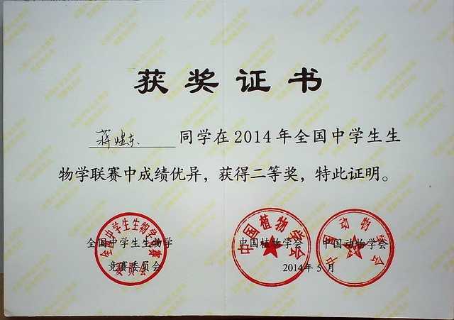 2014.05蒋煜东----获2014年全国中学生生物联赛二等奖(证书).jpg
