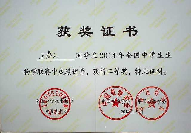 2014.05王鼎元----获2014年全国中学生生物联赛二等奖(证书).jpg