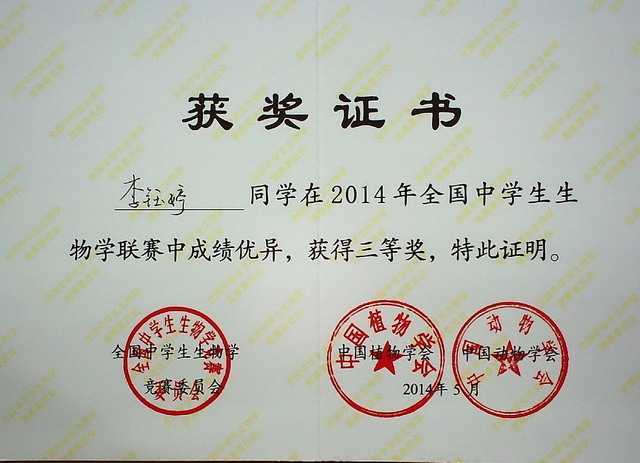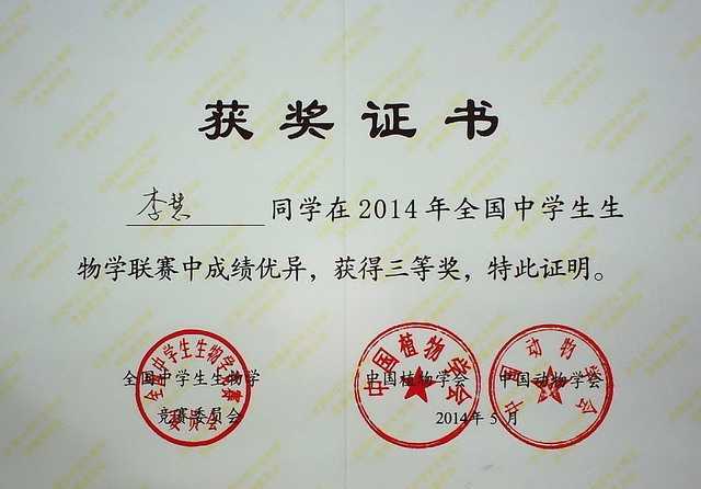 2014.05李慧----获2014年全国中学生生物联赛三等奖(证书).jpg