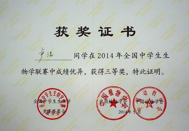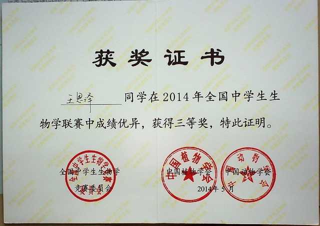 2014.05王恩泽----获2014年全国中学生生物联赛三等奖(证书).jpg