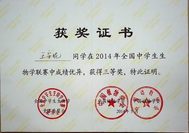 2014.05王安妮----获2014年全国中学生生物联赛三等奖(证书).jpg