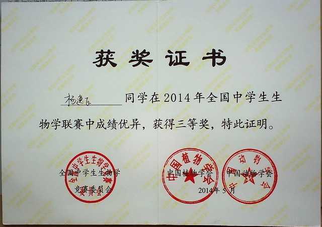 2014.05杨逸飞----获2014年全国中学生生物联赛三等奖(证书).jpg