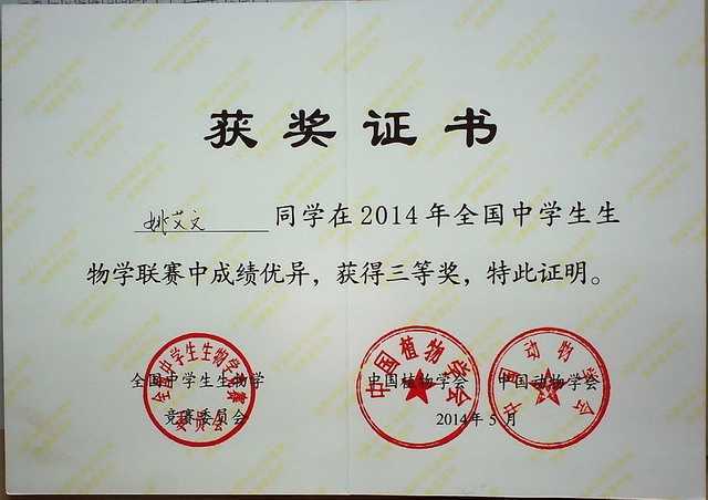 2014.05姚艾文----获2014年全国中学生生物联赛三等奖(证书).jpg