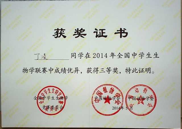 2014.05丁凌----获2014年全国中学生生物联赛三等奖(证书).jpg