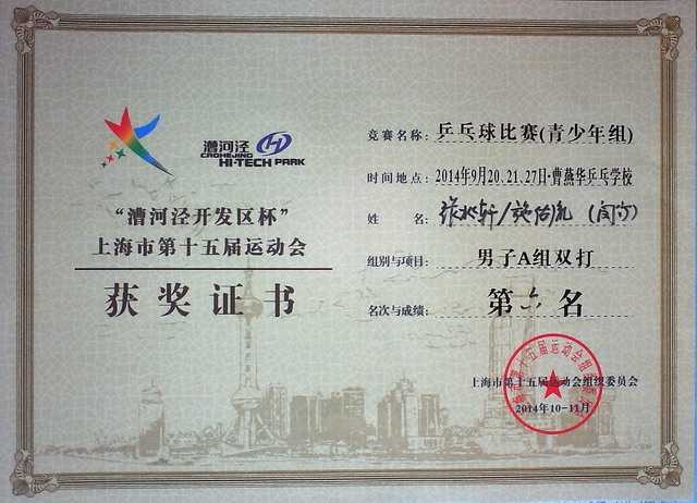 2014.10张兆轩、施估胤----获“漕河泾开发区杯”上海市第15届运动会乒乓球比赛男子A组双打(青少年组)第六名(证书).jpg