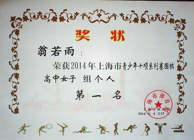 翁若雨----获2014年上海市青少年十项系列赛围棋高中女子组(个人)第一名(奖状)