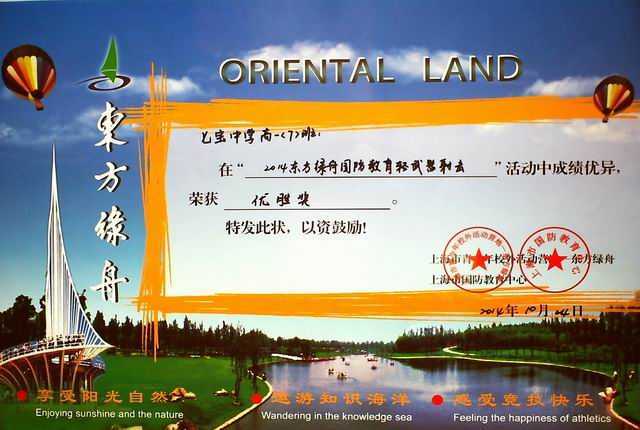2014.10七宝中学高一6班----获2014东方绿舟国防教育轻武器射击优胜奖(奖状)