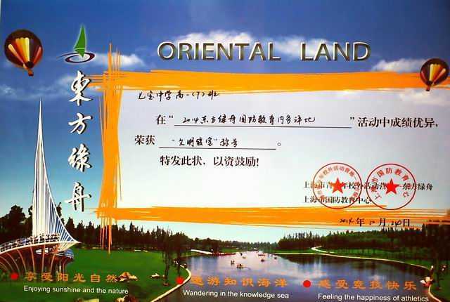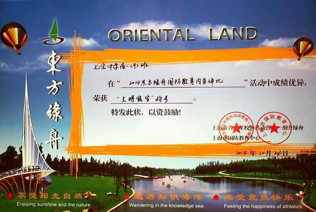 2014.10七宝中学高一13班----获2014东方绿舟国防教育内务评比“文明寝室”称号(奖状)
